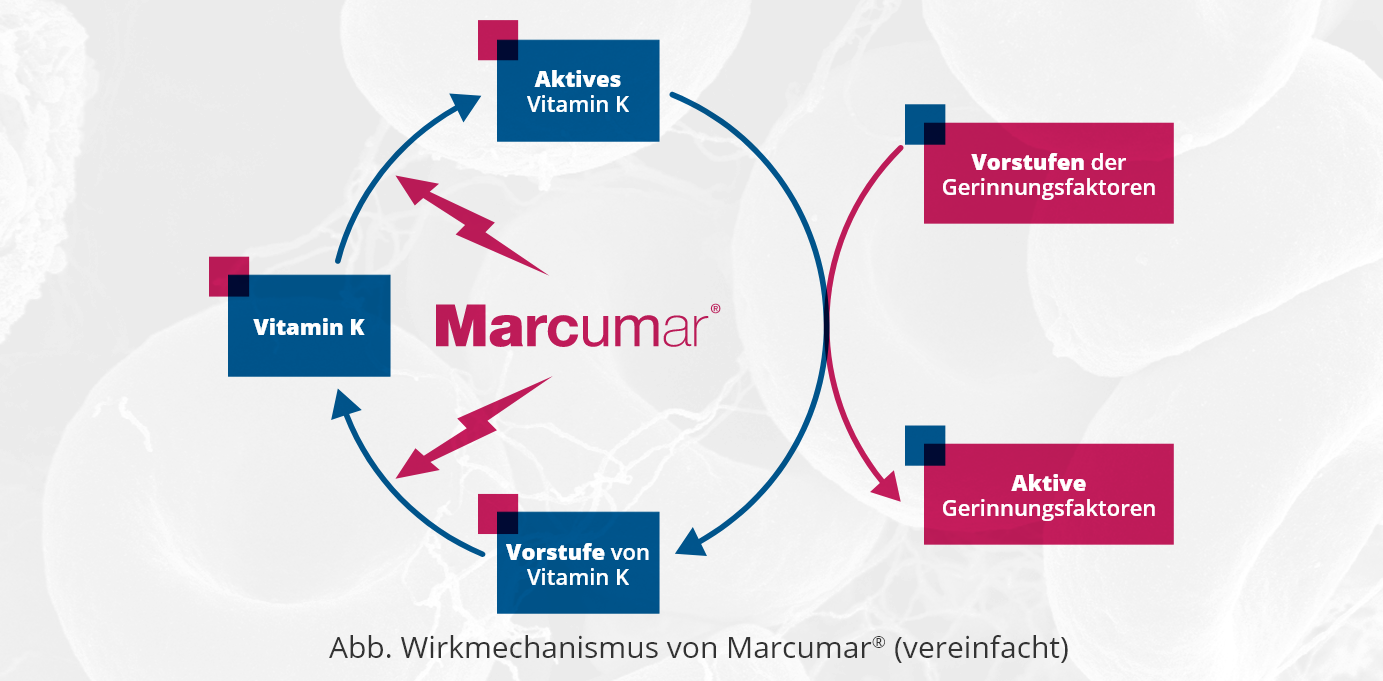 Marcumar® enthält den Wirkstoff Phenprocoumon, der in der Medizin als Antikoagulans, d. h. Gerinnungshemmer, eingesetzt wird. Phenprocoumon selbst gehört zu den Cumarin-Derivaten und wirkt als Vitamin-K-Antagonist.